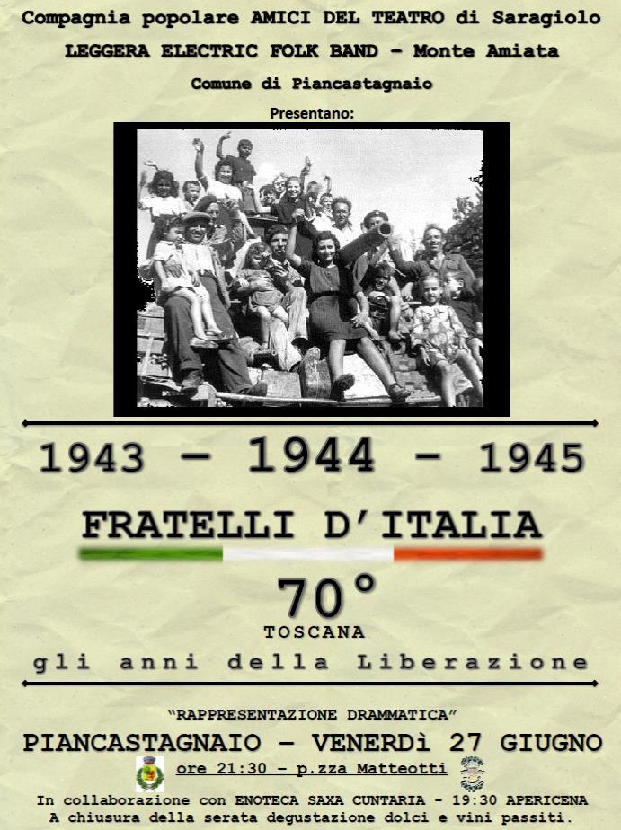 Appuntamento a Piancastagnaio con gli Amici del Teatro di Saragiolo assieme alla Leggera Electric Folk Band del Monte Amiata, l’Enoteca Saxa Cuntaria di Piancastagnaio e la collaborazione del Comune di Piancastagnaio, presentano “1943 – 1944 – 1945 Fratelli d’Italia”.