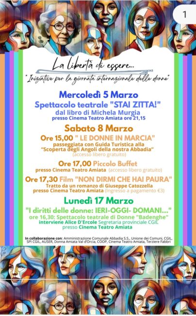 Sarà un 8 marzo di festa e di impegno quello di oggi ad Abbadia San Salvatore, in occasione della Giornata internazionale dedicata alle donne. Dopo la prima iniziativa che si è svolta il 5 marzo, con lo spettacolo teatrale tratto dal libro di Michela Murgia, “Stai zitta”, oggi sono in programma altri appuntamenti:
