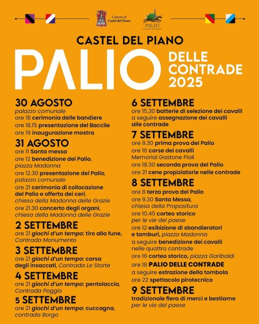 Il Palio di Castel del Piano, che si correrà l’8 settembre, è un evento che unisce storia, cultura e comunità, tra cortei, cerimonie e la corsa più attesa dell’anno. L’amministrazione comunale ha reso noto il programma completo dal 30 agosto al 9 settembre. Eccolo nella grafica sottostante.