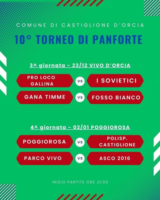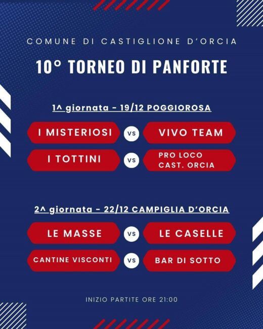 Torna a Castiglione d’Orcia da venerdì sera, 19 dicembre, alle ore 21, il torneo di Panforte comunale giunto alla decima edizione. Primo appuntamento a Poggio Rosa. Ecco i gironi con cui si sfideranno le squadre.