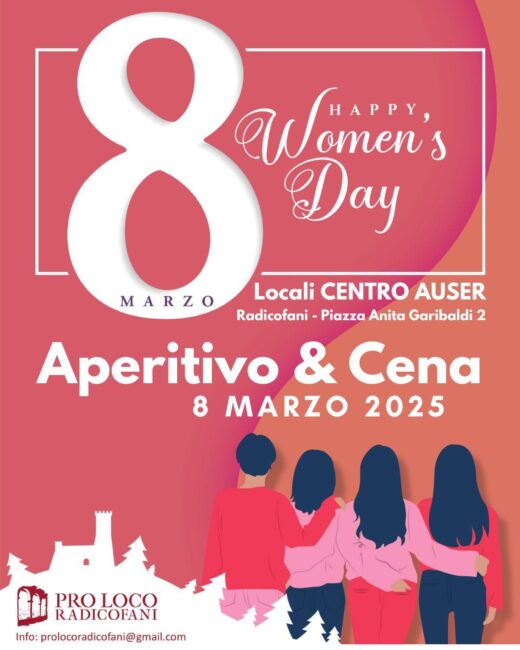In occasione della “Festa della Donna”, SABATO 8 MARZO 2025 alle ORE 20:00 presso i locali del CENTRO AUSER di Radicofani (Piazza Anita Garibaldi 2) la Pro Loco organizza un evento con Aperitivo & Cena. Menù: Aperitivo di benvenuto, antipasti misti, giro pizza (4 gusti), dolce. Prezzo 25 € Adulti – 15 Bambini (max 12 anni)