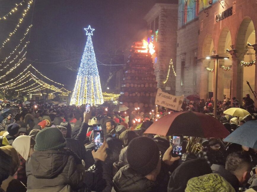“È la vigilia di Natale. Abbadia San Salvatore si illumina. Le Fiaccole tornano ad accendersi: un rito antico, comunità, calore umano nel cuore dell’Amiata. Grazie al sindaco Niccolò Volpini e a tutta Abbadia per custodire e rinnovare una tradizione che è identità, memoria e bellezza condivisa”. Questo il commento del Presidente della Regione, Eugenio Giani, che ieri sera è salito sulla scala e ha consegnato al Capofiaccola il fuoco per l’accensione della prima Fiaccola collocata davanti al Palazzo Comunale. C’era tanta gente: tanti badenghi, tanti ospiti, le autorità, con il Cardinale Augusto Paolo Lojudice. Il rito delle Fiaccole ha sconfitto anche la pioggia e la magia del rito condiviso dalla popolazione ha scaldato i cuori e illuminato a giorno tutta Abbadia San Salvatore, la Città delle Fiaccole: “Un rito che nasce dal lavoro, dalla condivisione e dal legame profondo con il territorio – si legge in un post del Comune di Abbadia – Le Fiaccole non sono solo un evento, ma il segno di una comunità che custodisce la propria storia e la rinnova ogni anno, insieme. Abbadia San Salvatore riconosce in questa tradizione la propria forza e il proprio senso di appartenenza. Evviva Le Fiaccole, evviva Abbadia San Salvatore”.