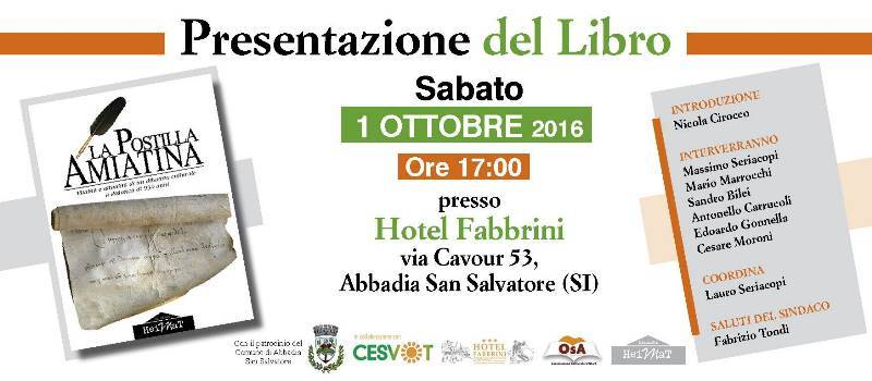 Presentazione del libro “La Postilla Amiatina 930 anni dopo” – ore 17.00 Hotel Fabbrini, via Cavour 53
