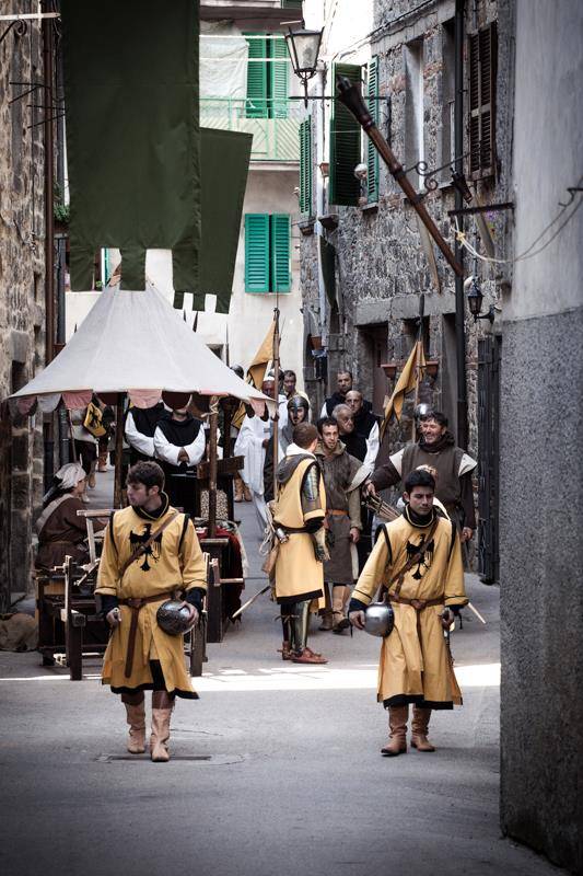 Per tre giorni il cuore del caratteristico borgo si popola di dame e cavalieri, mercanti e soldati, fanciulle danzanti e giovani atleti. I cittadini smettono gli abiti contemporanei e tornano a vestire quelli dei loro avi. Le piazze e le strade si trasformano in un palcoscenico naturale capace di accogliere taverne e botteghe di arti e mestieri mentre per le vie si muovono musicanti e giocolieri. Viene anche ricostruito un accampamento militare dove si susseguono tenzoni e duelli, sfide che culminano nella grande gara a giochi tra Terzieri chiamati a misurarsi con l’arco, le portantine e tante altre specialità. Si prepara così l’Offerta dei Censi recuperando una “pratica” spesso descritta nella ricca documentazione del secolo XIII, relativa ad Abbadia San Salvatore.