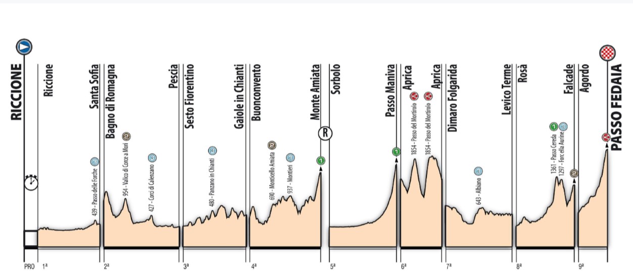• Venerdì 14 giugno 2019 1 a tappa: RICCIONE – SANTA SOFIA 143,2 km * Prima tappa in linea interamente romagnola, con partenza da Riccione. Tappa in gran parte pianeggiante (700 metri di dislivello totali), a 10 km dal traguardo si sale ai 439m slm del Passo delle Forche, poi si scende prima dell’arrivo a Santa Sofia.