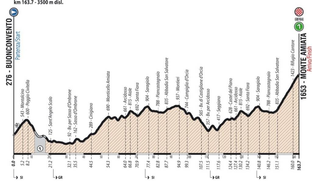 • Lunedì 17 giugno 2019 4 a tappa: BUONCONVENTO (SI) – VETTA AMIATA 163,7 km **** Il primo vero appuntamento ad alta quota, con arrivo in salita. Un altro omaggio al ciclismo “eroico” con la partenza da Buonconvento, il passaggio da Montalcino e un tratto di strada bianca a inizio tappa. Frazione nervosa che raggiunge addirittura i 3.500 metri di dislivello con la scalata finale al Monte Amiata (1.653m di altitudine).