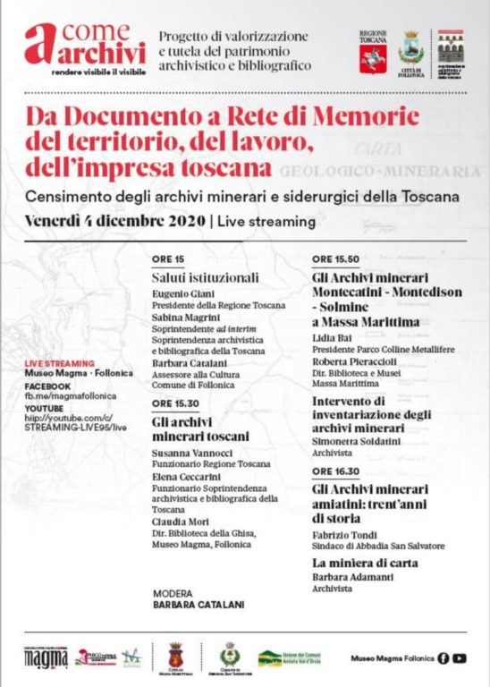 Il progetto sarà presentato venerdì 4 dicembre a partire dalle ore 15 in diretta streaming sulla pagina Facebook del Museo Magma di Follonica. L’evento on-line vedrà la partecipazione del presidente della Regione Toscana Eugenio Giani e della Soprintendente ad interim per la Soprintendenza Archivistica e Bibliografica della Toscana Sabina Magrini.