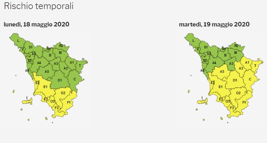 Anche la Regione Toscana prevede Codice giallo per pioggia e temporali anche forti sul Centro e Sud della Toscana a partire dalle 18 di oggi, lunedì 18 maggio per tutta la giornata di domani, martedì, fino alla mezzanotte.