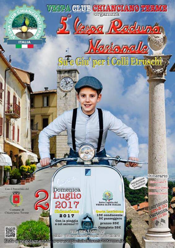 Tutto è ormai pronto per la V^ edizione di “Su e giù per i COlli Etruschi”, il Vespa Raduno eco-turistico non competitivo che partirà da Chianciani (ore 8.00 – Piazza Italia) domenica 2 Luglio per un percorso che toccherà le terre collinari tra la città termale, Montepulciano e Torrita di Siena in un ambiente non solo dal fascino unico, ricco di storia e di bellezze architettoniche e artistiche famose nel mondo, ma anche di peculiarità imprenditoriali e dell’associazionismo.