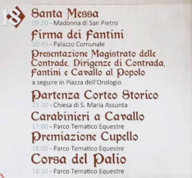 La giornata sarà lunga: prima la Santa Messa, poi la segnatura dei fantini, quindi il Corteo Storico e infine la corsa.