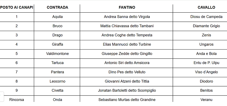 I dieci cavalli che hanno corso il Palio sono tornati tutti regolarmente nelle stalle delle rispettive Contrade.Questo lo schieramento ai canapi all’ordine del mossiere Renato Bircolotti.