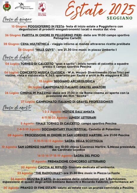 Le iniziative e gli eventi dell’Estate 2025 a Seggiano iniziano domani, 15 giugno, all’insegna dell’enogastronomia e della musica dal vivo, con la festa a Poggioferro. Di seguito l’intero cartellone da giugno ad agosto.