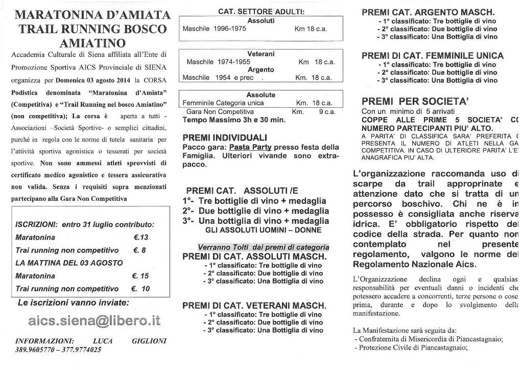 Grazie all’interesse e soprattutto alla grande determinazione e volontà del Pianese Luca Giglioni, si svolgerà il prossimo 3 Agosto la prima edizione della “Maratonina dell’Amiata”, corsa competitiva podistica tra i bellissimi boschi dell’Amiata. Contestualmente si svolgerà il “Trail Running nel bosco Amiatino” corsa non competitiva.