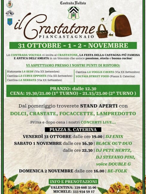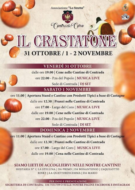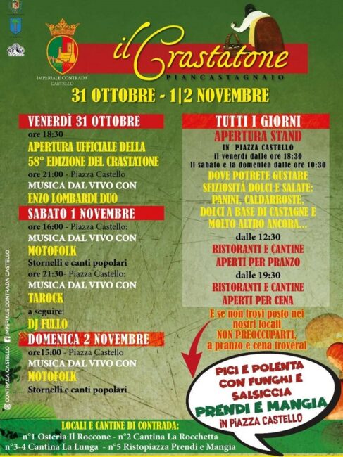 Mancano ormai pochi giorni al Crastatone, la Festa della Castagna più antica del Monte Amiata, che inizia venerdì 31 ottobre per concludersi domenica 2 novembre. La festa organizzata dalla Pro Loco, con il Comune e le Contrade, ha preso il nome dalla “crastata”, termine pianese mutuato da “castrata”, cioè la castagna che viene incisa prima di metterla a cuocere sul fuoco.