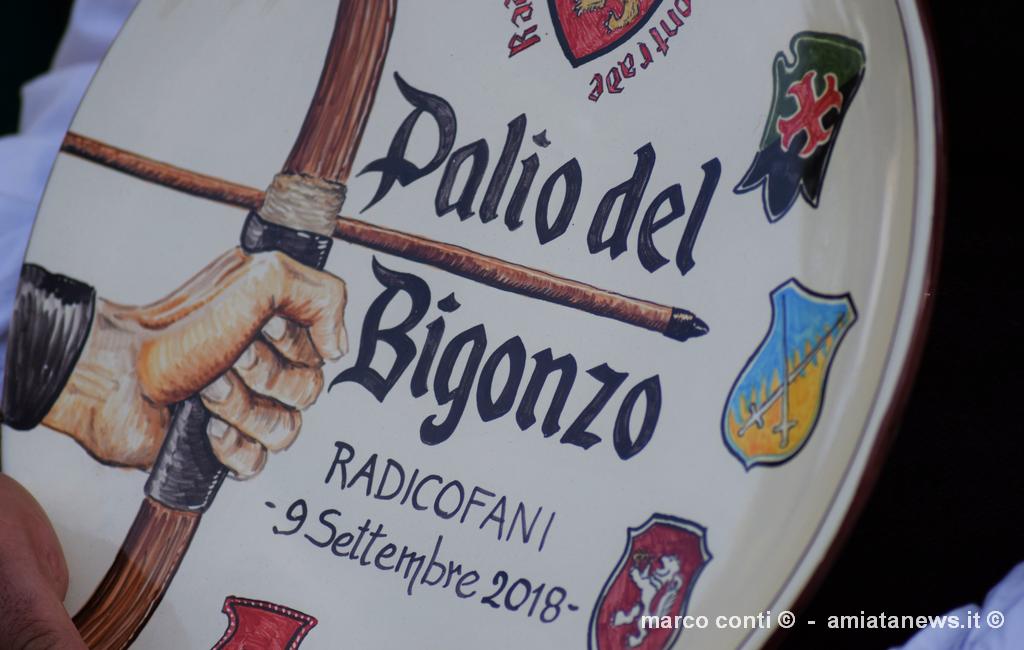 Come si intuisce, due sono le competizioni principali: la gara degli arcieri e la corsa del palio, con la prima che decide l’ordine di partenza, assegnando al vincitore la posizione migliore e, a scalare, alle altre contrade, rispettando il punteggio e la relativa graduatoria. Si determina così una “griglia” di partenza da parte delle due coppie di “barellieri” che si alterneranno durante il percorso. Si corre trasportando un contenitore di legno, il “bigonzo”, un tempo utilizzato per la vendemmia, zavorrato con un peso uguale per tutti, calcolato di volta sulla base del più pesante (intorno ai 20 chili). La competizione, che sarà ripresa per l’intero percorso e proiettata su un grande schermo nei pressi della partenza si svolge lungo le vie del paese, con partenza dalla porta Romana e arrivo in direzione nord nella centrale piazza San Pietro. La manifestazione, relativamente recente, è la celebrazione degli insediamenti che formavano la comunità di Radicofani, ora concentrata in un unico abitato, ai piedi del castello, ma anche di quella che un tempo era l’attività principale del territorio. La viticoltura, negli statuti del 1255 e del 1411, era meticolosamente regolamentata. La produzione era cresciuta durante i secoli sino ad arrivare a duemila some di vino, equivalenti a tremila ettolitri. La zona più vocata per questa produzione era una valle dove, dal XVII secolo, fu costruito il piccolo santuario della Madonna delle vigne, la cui festa si celebra ogni 8 di settembre. Ricollegandosi proprio a questa festa nell’anno 2006 fu riproposta la corsa del Palio relativi ai quattro borghi che esistevano fin dal Medioevo. Il “Palio del bigonzo” si presenta, anche sotto l’aspetto artistico, in grande stile: Iustina Barbulescu ha dipinto il drappellone, che andrà alla Contrada vincitrice, mentre le Ceramiche il Volo di Sarteano hanno realizzato il simbolico piatto dipinto e la pergamena destinati agli arcieri più bravi. Per inciso, Radicofani vanta una società sportiva che primeggia ai massimi livelli di una particolare disciplina, quella di tiro con l’arco da caccia, che fa capo a una federazione del Coni. Sarà una sfida tra molti protagonisti ai recenti campionati italiani, nelle varie categorie, da no perdere Intanto sono stati rinnovati i vertici dell’organizzazione della festa. Al Magistrato delle contrade, all’unanimità, è stato eletto nuovo rettore Alfredo Rossi, già membro onorario insieme a Renato Magi e a Giovanni Fatini, scomparso di recente, tra gli ideatori del Palio radicofanese: a lui è dedicato il torneo degli arcieri. Anche le Contrade, che nel nome ricordano i vari borghi di Radicofani, hanno rinnovato i loro vertici.