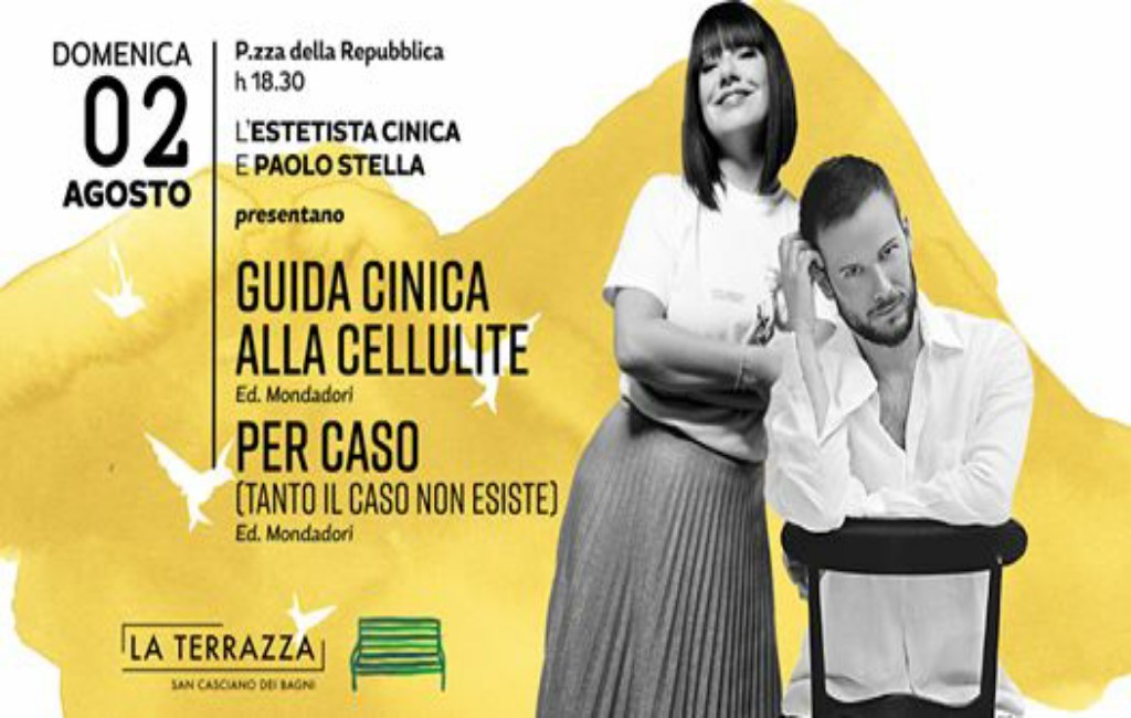 Paolo Stella e Cristina Fogazzi sono protagonisti domenica 2 agosto (ore 18,30) del ciclo di appuntamenti della Terrazza di San Casciano dei Bagni, il progetto culturale che anima l’estate 2020 promosso dal sindaco della cittadina senese, Agnese Carletti, da Federica Damiani e da realtà locali come lo spa resort Fonteverde. Legate da una profonda, divertente e sincera amicizia, le due star del web si presentano in piazza della Repubblica per presentare il loro nuovi libri editi da Mondadori: Per caso (tanto il caso non esiste), il secondo romanzo del content digital creator Paolo Stella, e la nuova edizione della Guida cinica alla cellulite firmata dalla beauty guru Cristina Fogazzi, imprenditrice conosciuta da tutti come l’Estetista cinica.