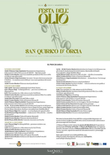 SABATO 6 DICEMBRE – Dalle 8 alle 19 Mercatino artigianale a Porta Nuova. Alle 9.30 via al tour in e-bike in Val d’Orcia; e sempre alle 9.30 partenza del Trekking dell’olio, un percorso turistico fra le bellezze architettoniche di San Quirico con degustazione. Alle 10 apertura degli stand dei produttori di olio extravergine d’oliva (fino alle 19.30). Si terrà la festa dell’albero (ore 10); degustazione Impariamo a riconoscere l’olio d’oliva a cura di Aicoo (ore 11). Alle ore 14 Olio..mpiadi, la corsa di piccoli e grandi atleti. Dalle 14.30 (fino alle 16.30) nel Centro storico, intrattenimento lungo le vie del paese con gli artisti di strada Eventastic e Laura Magic Farmer, pomeriggio tra Clown, Mimo, Giocoleria, Sculture con palloncini e Bubbles Show. Alle 15.30 Piazza Chigi, laboratorio Olio ed erbe: oleotico al rosmarino”; quindi visita al frantoio Simonelli (16); ed alle 21 in Piazza della Libertà, concerto spettacolo con DuoVa.