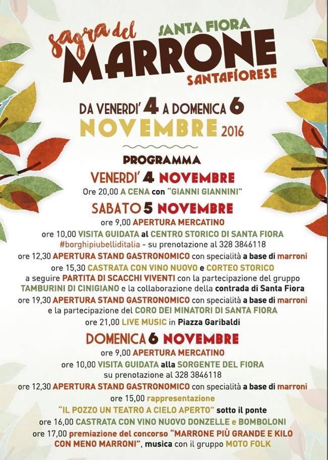 La Sagra del Marrone Santafiorese prende il via venerdì sera, alle ore 20, allo stand gastronomico, con la cena e lo spettacolo di cabaret del comico toscano Gianni Giannini (prenotazioni al 328 384 6118). Sabato 5 novembre, alle 9 apre il mercatino e alle 10 ha inizio la visita guidata del centro storico su prenotazione (328 38 46 118). Alle 12 e 30 apertura dello stand gastronomico, alle 15 e 30 appuntamento con la castrata, il vino nuovo e il corteo storico. A seguire si terrà la partita di scacchi viventi, con la partecipazione dei Tamburini di Cinigiano e la collaborazione della contrada di Santa Fiora. La sera lo stand gastronomico aprirà alle 19 e 30. Nell’occasione si esibirà il coro dei minatori e a seguire la musica dal vivo in piazza Garibaldi. Domenica 6 novembre, alle 9 apertura del mercatino, alle 10 visita guidata alle sorgenti del Fiora (prenotazioni su 328 38 46 118). La domenica lo stand gastronomico sarà aperto solo a pranzo. Alle 15 si terrà l’esibizione teatrale  sotto il ponte dal titolo “Il pozzo un teatro a cielo aperto”. Alle 16 castrate con vino nuovo, donzelle e bomboloni. Alle 17 premiazione del concorso “Marrone più grande e kilo con meno marroni” e la musica del gruppo Moto Folk.