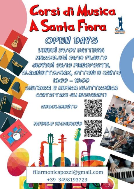 Santa Fiora si prepara a un autunno all’insegna della musica. La Filarmonica Pozzi organizza infatti i nuovi corsi di musica, aperti a bambini, ragazzi e adulti, con una serie di open days gratuiti per provare gli strumenti e incontrare gli insegnanti.