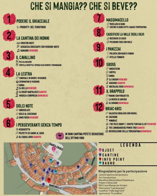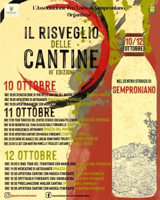 Semproniano è pronta ad accogliere visitatori e amanti del buon gusto tipico di queste parti, il 10,11 e 12 ottobre per la 3º edizione del “Risveglio Delle Cantine” organizzata dalla Pro Loco. Tutte le cantine nel centro storico verranno risvegliate e i  cantinieri saranno pronti ad offrire: ottimo cibo, ottimo vino, spettacoli itineranti, Mercatini di artigianato e molto molto altro. Ecco il programma e le offerte enogastronomiche della festa.