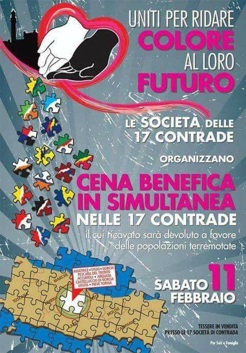Le Società di Contrada hanno inoltre messo a punto l’organizzazione della cena benefica in simultanea, con prodotti acquistati direttamente da aziende dei luoghi terremotati, che il prossimo 11 febbraio vedrà certamente una grandissima partecipazione.