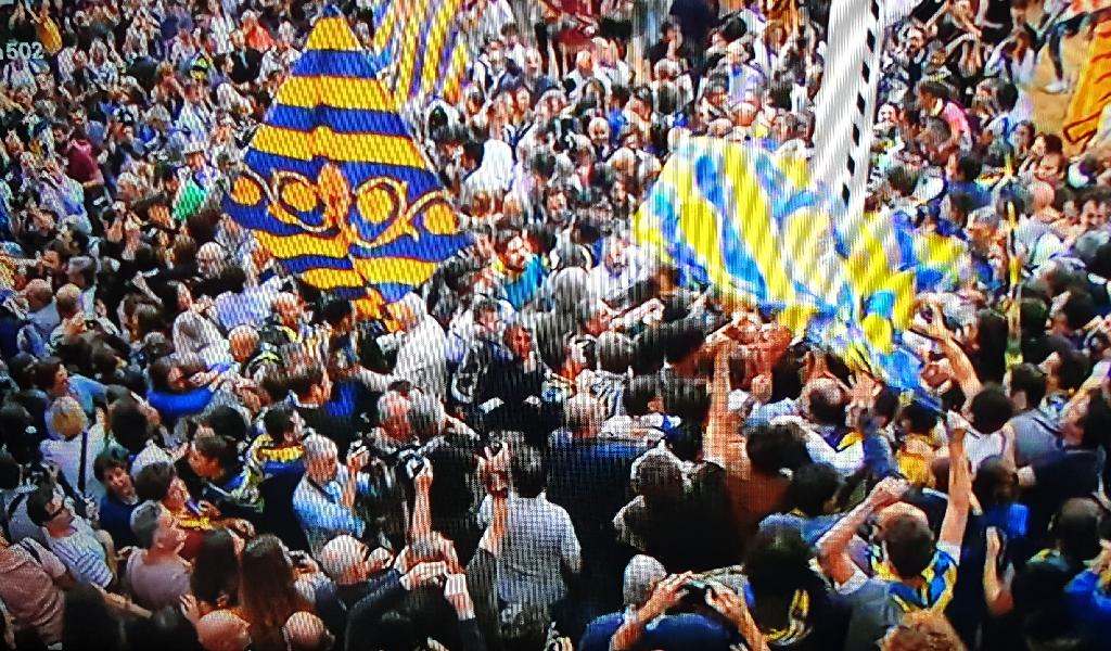 Al sesto tentativo, dopo circa un’ora dall’ingresso dei cavalli (ore 17), tutti via con Chiocciola, Giraffa, Selva e Lupa più pronte e prime a Fonte Gaia. A S. Martino passa prima la Chioccio, poi la Giraffa e la Selva. Poi Civetta e Tartuca con Torre e Oca a contrastarsi con Carburo (torre) che manda ai materassi la rivale (Oca) coinvolgendo anche la Lupa con Bighino che gira ultimo. Al Casato prima la Chiocciola, poi la Giraffa, poi la Civetta mentre Selva, Tartuca e Nicchio si apprestano a girare.  A Fonte Gaia, la Civetta passa Giraffa e Chiocciola mentre le distanze si accorciano leggermente tra le sei Contrade che dal Casato a San Martino rimangono nelle medesime posizioni. La Civetta non gira e va diritta ai materassi e così la Chiocciola seguita da Giraffa, Tartuca (ottima traiettoria), Nicchio e Selva si ritrova prima fin quasi in cima alla salita del Casato quando la Tartuca la passa all’interno, cade e poi la carambola che regala la prima posizione alla Tartuca, la seconda alla Chiocciola che vanno scosse fino al terzo San Martino (si vede un ferro volare, forse proprio del cavallo della Chiocciola) e poi all’ultimo Casato. Subito dopo il Nicchio che cerca disperatamente e inutilmente di passare ma la Tartuca, che sembra essere guidata, rimane prima “con sicurezza” e vince il Palio con il biondo Remorex (esordiente) e lo stesso eccellente Tempesta che guardava dal tufo.Siena_Palio_Straordinario_2018_20181020_174729Un Palio, quello dedicato alla fine della Seconda Guerra Mondiale, che lascia il pensiero per questi ragazzi, fantini coraggiosi, caduti quasi tutti sul campo, a dieci giorni dalla fine di Ottobre. Così come per i cavalli, a fine stagione e in sette esordienti sul tufo. Molti i pensieri: il primo alla salute di tutti e, subito dopo, alla grande festa senese, unica, irrinunciabile e viva in eterno sempre.