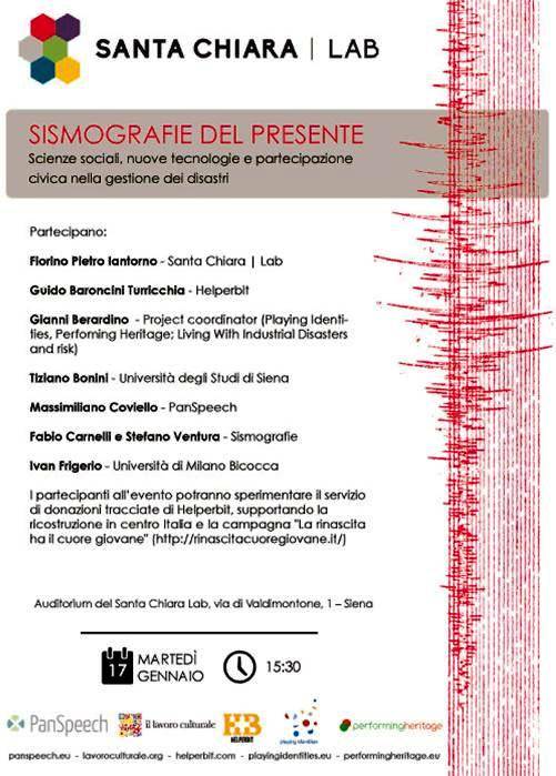 Il seminario “Sismografie del presente. Scienze sociali, nuove tecnologie e partecipazione civica nella gestione dei disastri.” si svolgerà per Martedì. 17 Gennaio dalle 15:30 presso l’auditorium dell’Università degli Studi di Siena