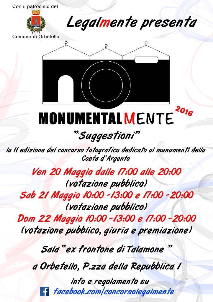 Dal 20 al 22 maggio, nella sala espositiva “Ex Frontone di Talamone”, prende il via la seconda edizione di MonumentalMente, il concorso fotografico dedicato ai monumenti della Costa d’Argento organizzato dall’associazione LegalMente e patrocinato dal Comune di Orbetello.