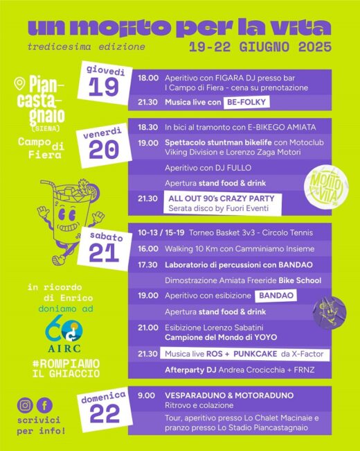 “Un Mojito per la vita” è cominciato ieri sera al Campo di Fiera di Piancastagnaio. Si andrà avanti fino a domenica 22 giugno con il mix che ormai da tredici anni fa centro: buona musica, drink e gastronomia. Ma a tutto questo si aggiungono finalità nobili: “Un Mojito Per La Vita” nasce infatti a giugno 2012, ad un mese dalla scomparsa prematura di Enrico Eugeni, amico di tutto il team degli organizzatori. Per ricordarlo gli amici hanno voluto ogni anno questo appuntamento attraverso il quale vengono raccolti fondi da destinare ad AIRC per sostenere la ricerca sul cancro.