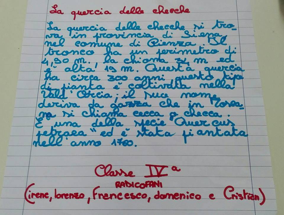 Tra le iniziative quella di Opera Val d’Orcia,  associazione culturale del territorio con l’obiettivo non solo di tutelare il patrimonio ambientale ma anche di relazionarlo: “Ci recheremo domani nelle scuole valdorciane per consegnare i sacchetti delle ghiande della Quercia delle Checche, di un vademecum e per tenere una piccola lezione di educazione ambientale. In questi giorni sono state prenotati i sacchetti contenenti buon terriccio e 12/15 ghiande della “Querciona”, raccolte nelle ultime settimane dai volontari – ci scrivono da Opera Val d’Orcia -. Il progetto è al terzo anno di attività e si concluderà  proprio in occasione della “Festa degli Alberi”, con le scuole materne ed elementari nei diversi plessi della Val d’Orcia, congiuntamente alla consegna delle ghiande e del vademecum a bambini e maestre e ad una breve lezione di educazione ambientale”.