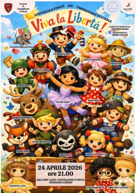 Il Comune di Castiglione d’Orcia ricorda l’appuntamento di stasera, 24 aprile alle ore 21 nella Sala della Pro Loco, per lo spettacolo finale del Laboratorio Teatrale “Viva la Libertà”. Scrive il Comune: “Si tratta di un progetto di teatro molto interessante per i bambini, che abbiamo finanziato come Comune con una piccola compartecipazione dei genitori, come doposcuola del lunedì. Una proposta di incontro, socializzazione e crescita formativa e culturale per i nostri bambini e bambine , ragazzi e ragazze. Ringraziamo per il lavoro svolto Valeria Bassi e John Cuevas con l’associazione i Macchiati”.