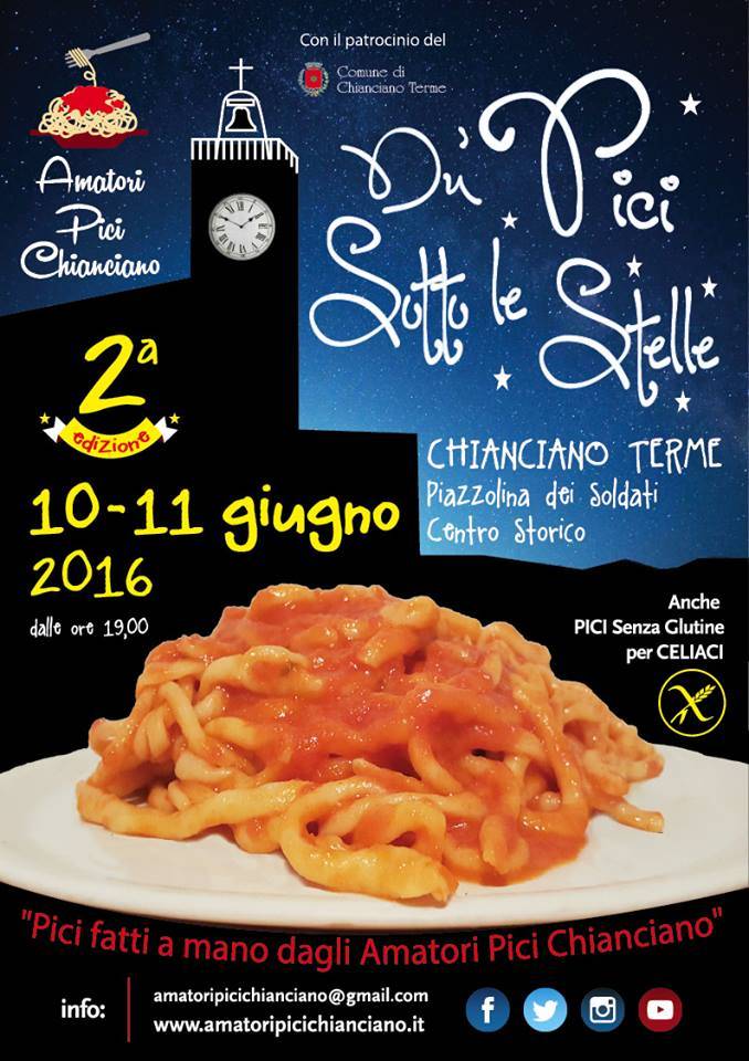 Ad organizzare la due giorni gastronomica l’attivissima associazione “Amatori Pici Chianciano”, che a seguito del successo della prima edizione ha deciso quest’anno di raddoppiare l’impegno per rendere possibile a tutti la degustazione di questa rinomata specialità gastronomica del sud-senese.