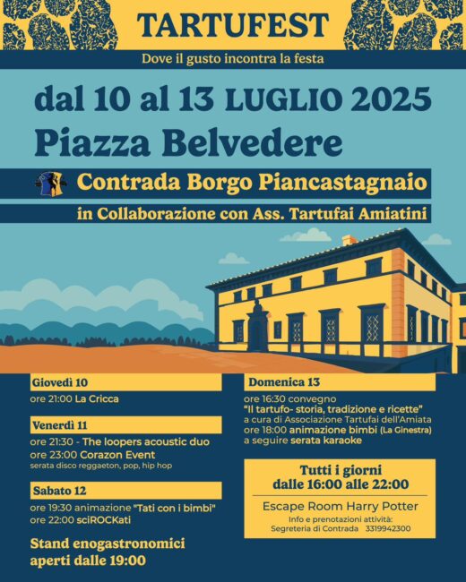 Quattro giorno di buon cibo, in Piazza Belvedere a Piancastagnaio, con il tartufo a farla da padrone, divertimento e musica live. Sono gli ingredienti di “Tartufest”, l’evento organizzato dalla Contrada Borgo di Piancastagnaio, con la collaborazione dell’Associazione Tartufai Amiatini, che si apre oggi, giovedì 10 luglio e si chiuderà domenica 13 luglio. Ci sarà anche Scuola di magia alla maniera di Harry Potter. Sotto, nella locandina, il programma completo.