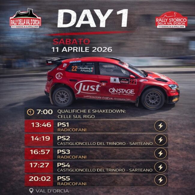 Si comincia presto al mattino con qualifiche e shakedown a Celle sul Rigo, poi si entra nel vivo della competizione con le prime sfide vere. Radicofani da ripetere tre volte che apre e chiude le prove speciali in programma, con l’ultimo passaggio in notturna, intervallata dalla doppia ripetizione della Castiglioncello del Trinoro – Sarteano, per un totale di 52,68 Km di tratti cronometrati.